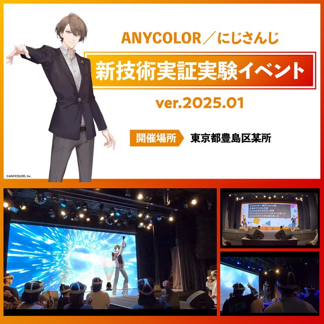 2025年1月8日(水)〜9日(木) 東京都豊島区某所にて「ANYCOLOR/にじさんじ 新技術実証実験イベント ver.2025.01」という名称で、弊社が開発中のMR(複合現実)技術を用いて、ヘッドマウントディスプレイを着用しながら「にじさんじ所属VTuberと現実空間を融合させた空間」を体験するイベントを実施。